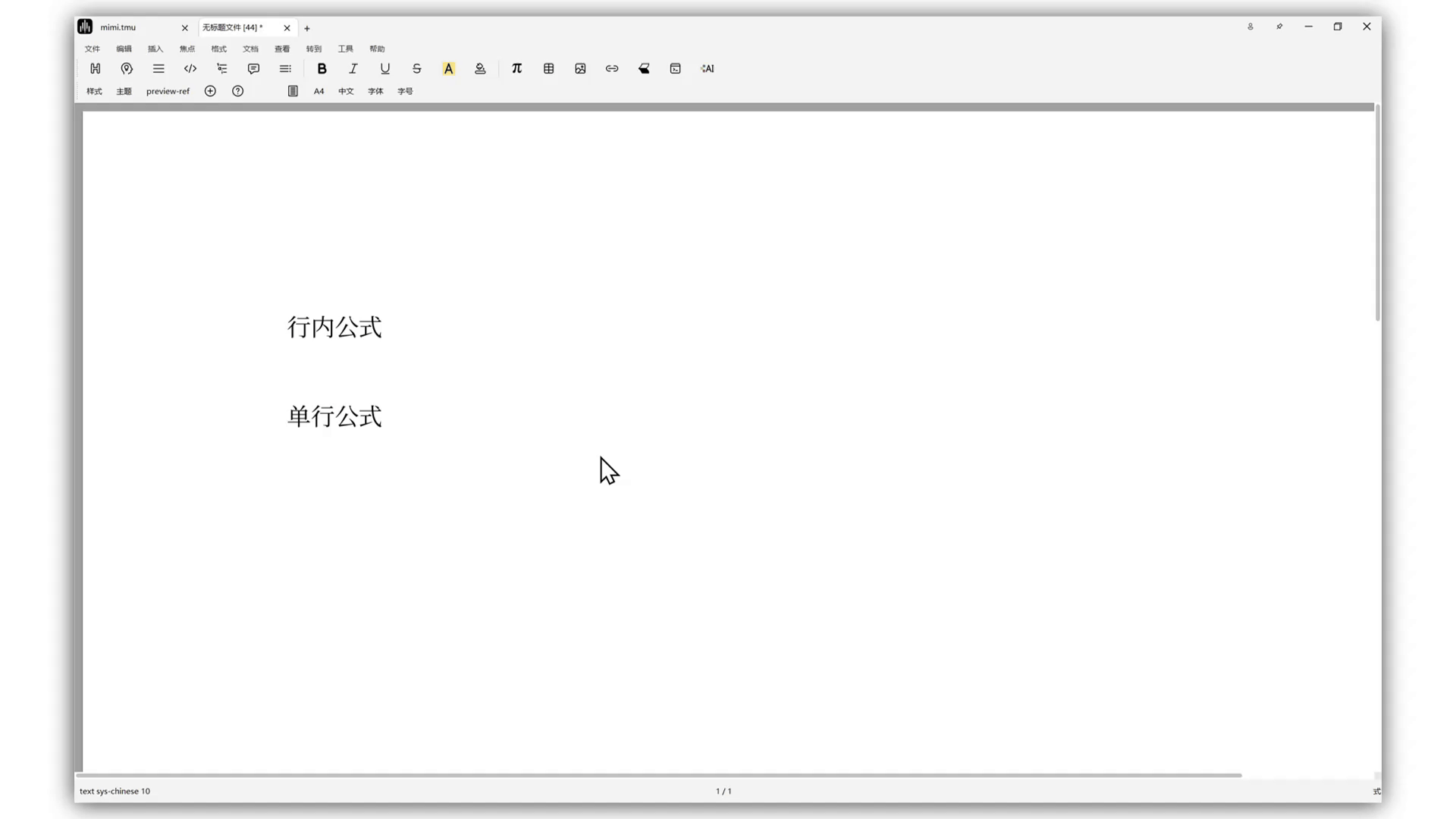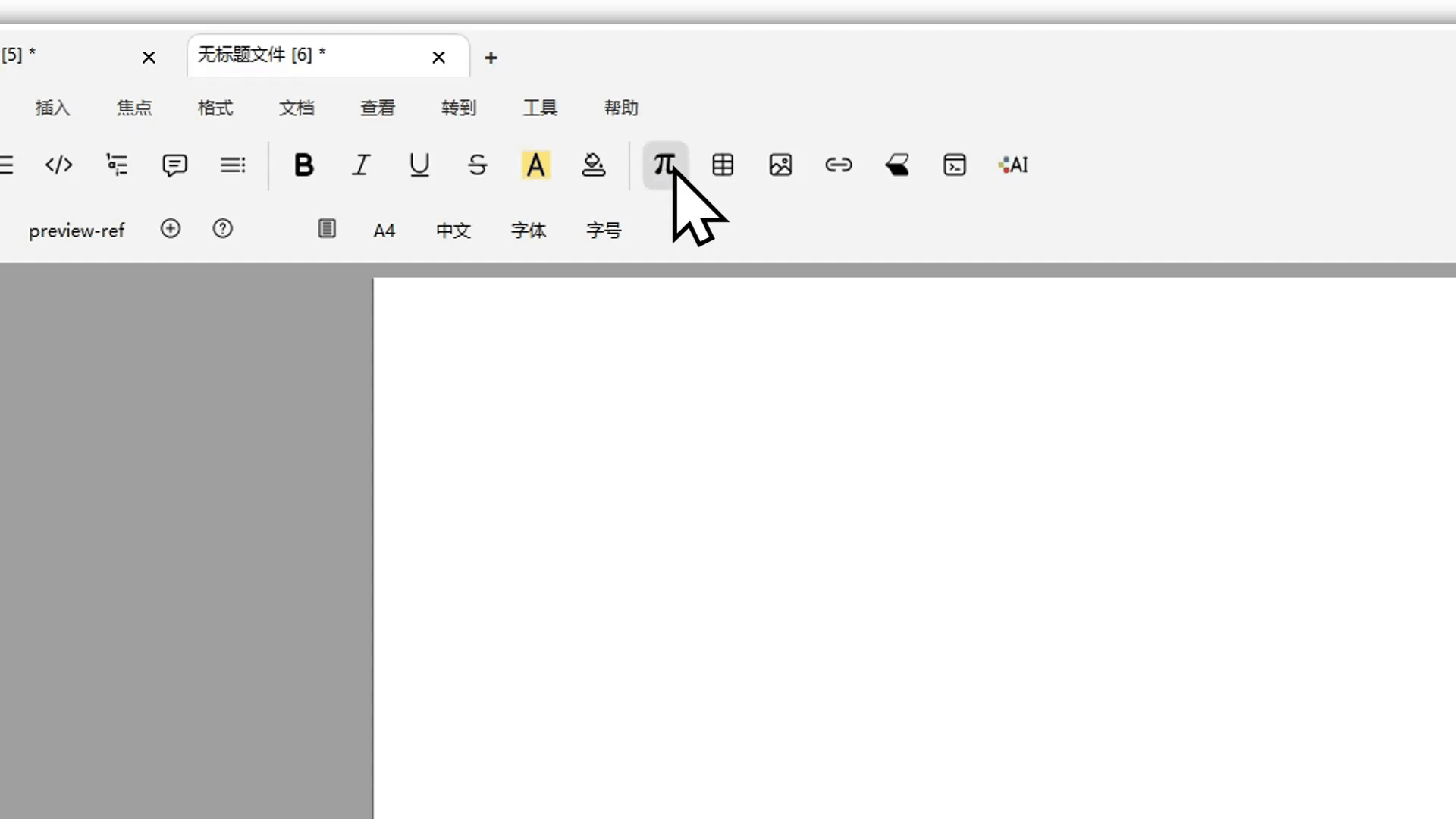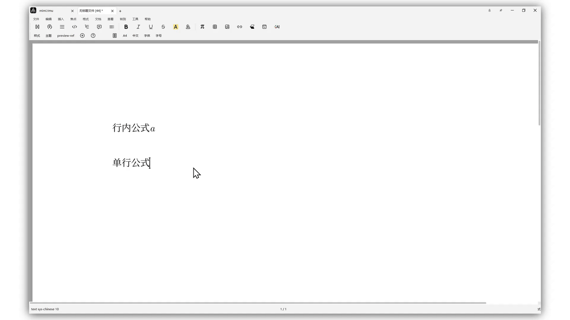 In text mode, click the π button in the mode toolbar, then choose inline formula, single-line formula, or multi-line formula.