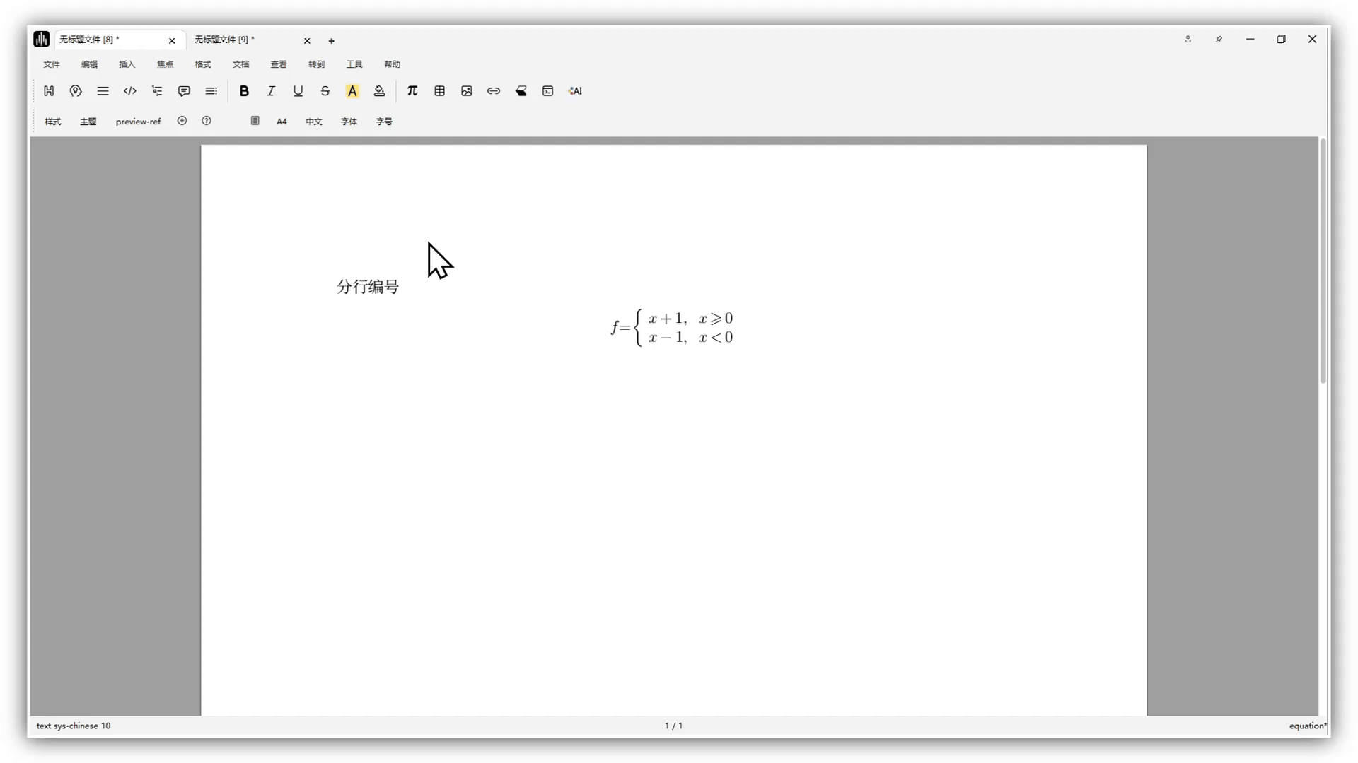 Piecewise functions can be numbered as a whole formula, or line by line. If you select the formula and click