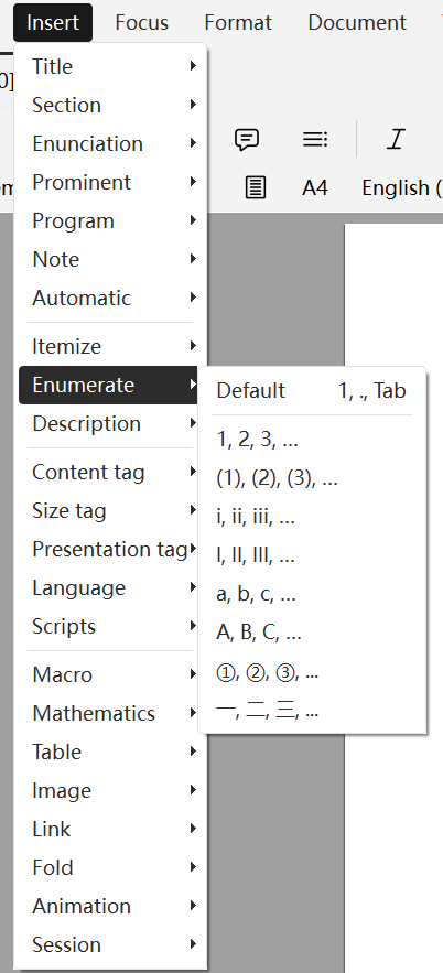 a. Click Insert →Enumerate in the menu bar. You can choose different formats.