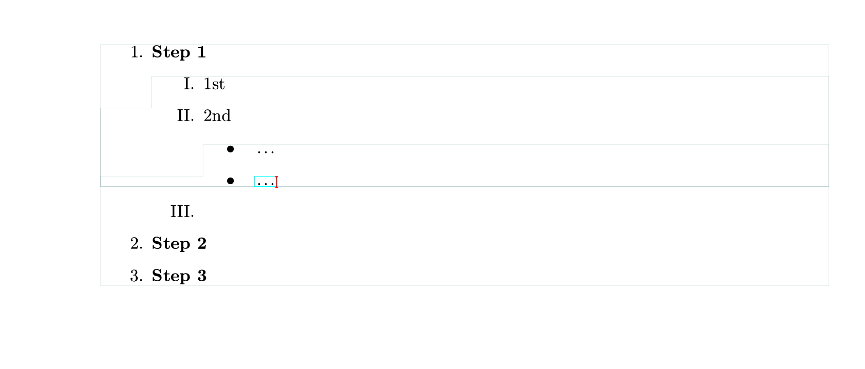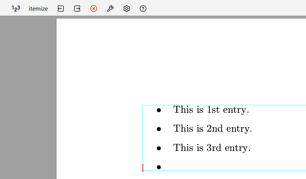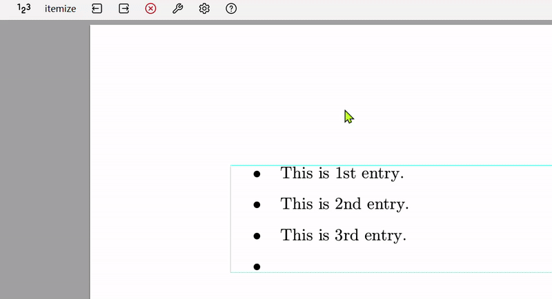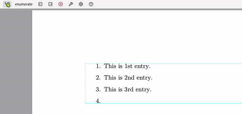 After entering an enumerate list (or itemize list) environment, enumerate and itemize lists are rendered as shown in the picture below: