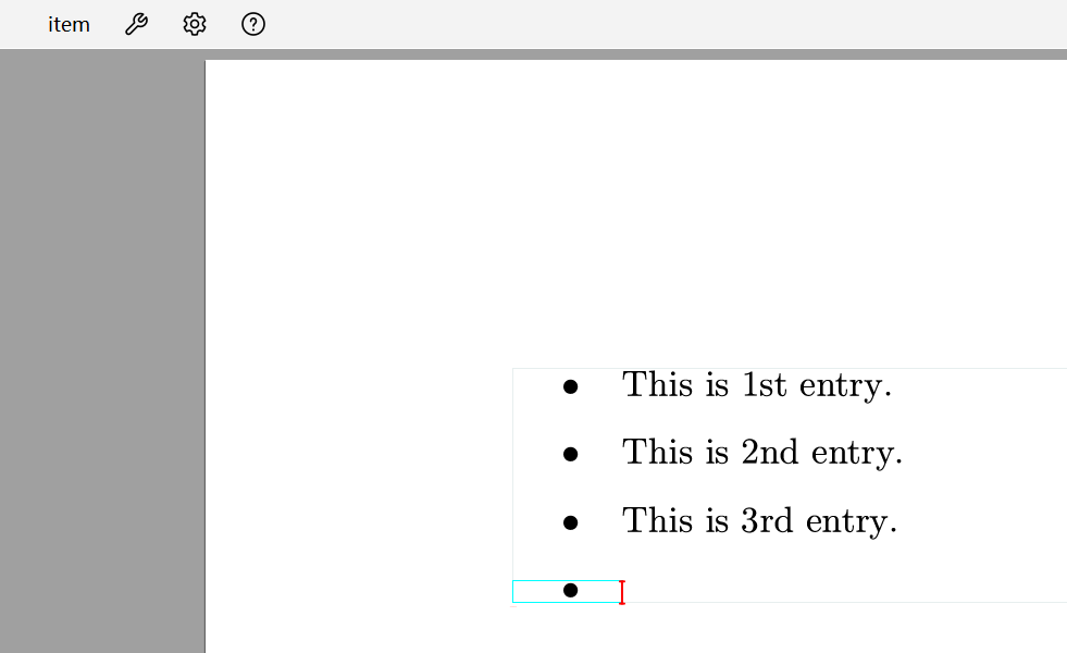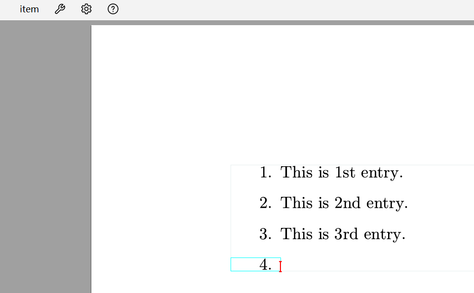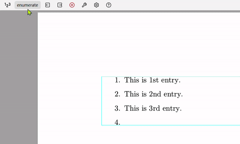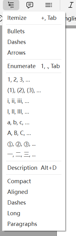 In the list environment, you can click the Structured variant option in the focus toolbar to change the numbering style for enumerate lists, or the bullet type for itemize lists. For example, you can change the numbering from Arabic numerals to lowercase Roman numerals.