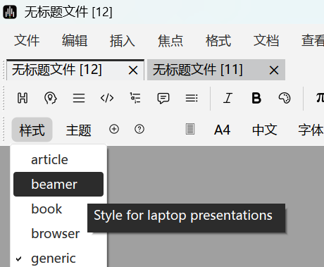 After starting Liii STEM, click Style -> beamer in the top-left menu bar (as shown below)