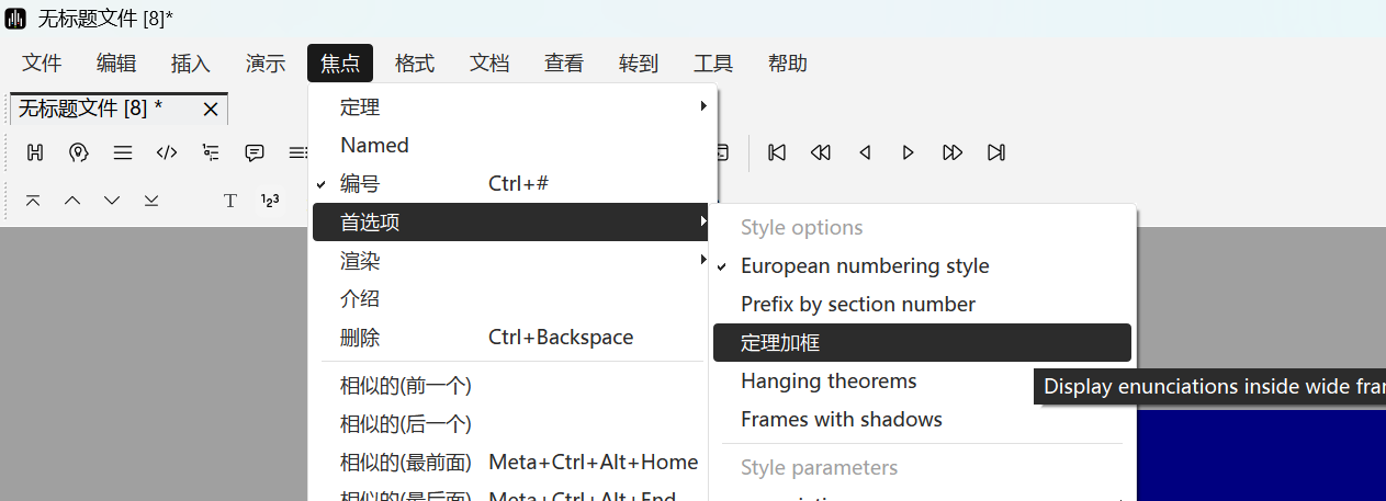 First enter the enunciation that needs background rendering, then click Focus -> Preferences -> Theorem Border in the toolbar. This allows you to add borders to enunciations. This operation makes theorem and other enunciation environments visually independent from other text content. (Operation method and effect before and after operation, as shown below)