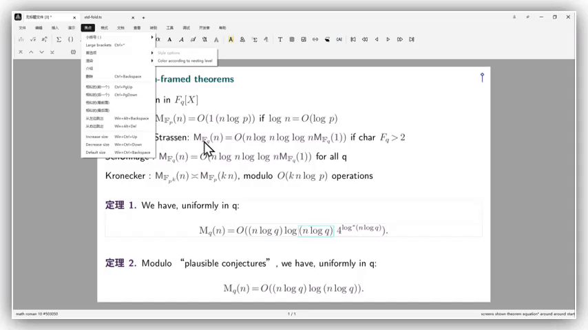 First enter the enunciation block that needs background rendering, then click Focus -> Preferences -> Theorem Border in the toolbar. This adds a border to the enunciation block, making theorem-style environments visually independent from other text content. (The operation and before/after effect are shown below.)