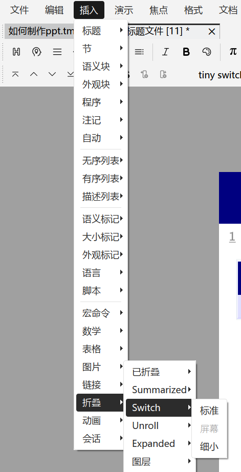 Toggle and Collapse->Already Collapsed->Defaultto insert a collapsing environment, click the left dot to switch state.