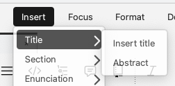 In text mode, click Insert → Title to insert either a Title or Abstract environment.