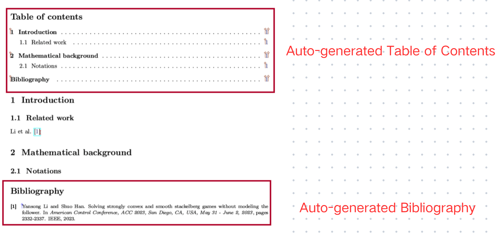 In Liii STEM, the Table of Contents and Bibliography are categorized as automated content (content that does not require manual entry into an environment). This section teaches you how to insert automated content like the Table of Contents and Bibliography, as shown below.