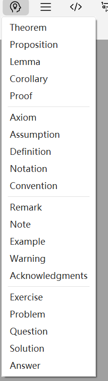 In text mode, you can insert different types of enunciations environments from the mode toolbar, as shown below: