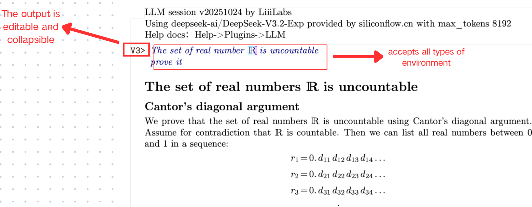 Additionally, LLMs in Liii STEM accept all types of environments as prompts! Such as enunciations and mathematics.