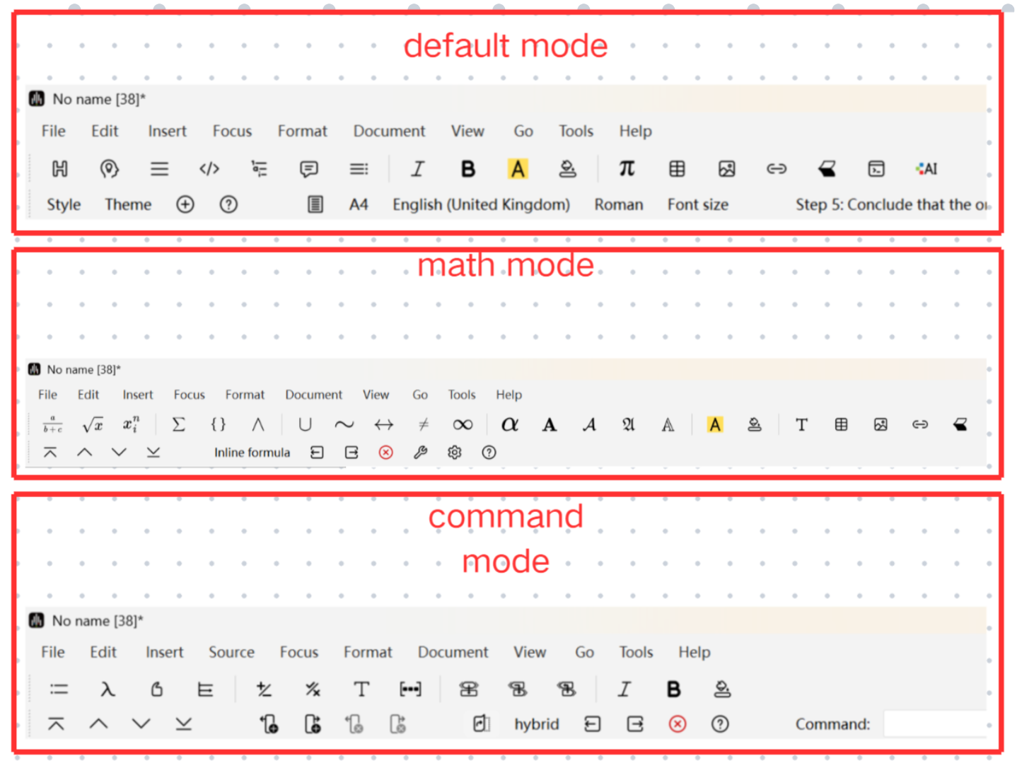 Liii STEM provides three independent editing modes for different writing needs. Please always be aware of the current mode during writing. The three modes are: