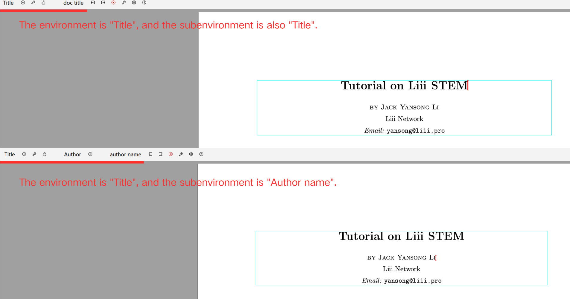 For example, within the title environment in text mode, when you put your cursor in the doc title (one subenvironment) versus the author (another subenvironment), the focus (current environment) toolbar changes accordingly, and the font used in the author subenvironment differs from the doc title environment.