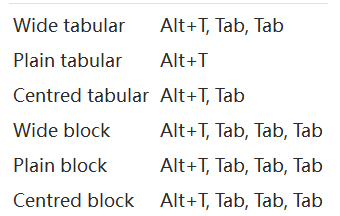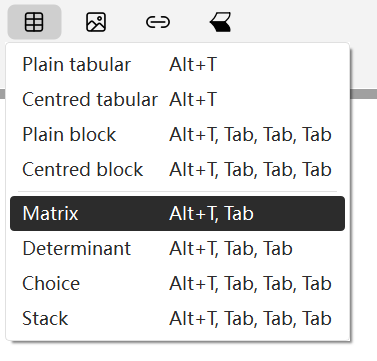 In Liii STEM, matrices, aligned formula , etc., can all be regarded as "tables" ( Inserting a table by pressing Alt + t in math mode, it can be transformed into matrices, determinants, etc. by Tab cycling).