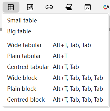 Insert Table: Click the insert a table button in the mode toolbar (as shown below) and select the table type.