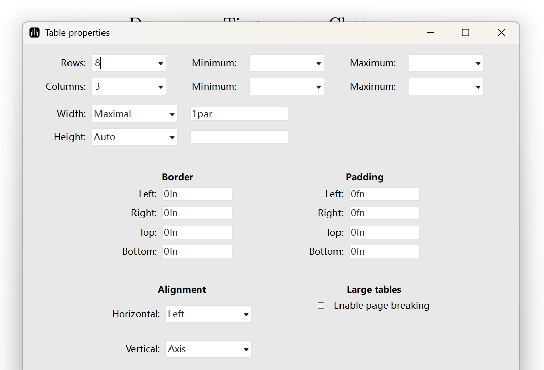b. Set "Rows" and "Columns" in the Table Properties window.
